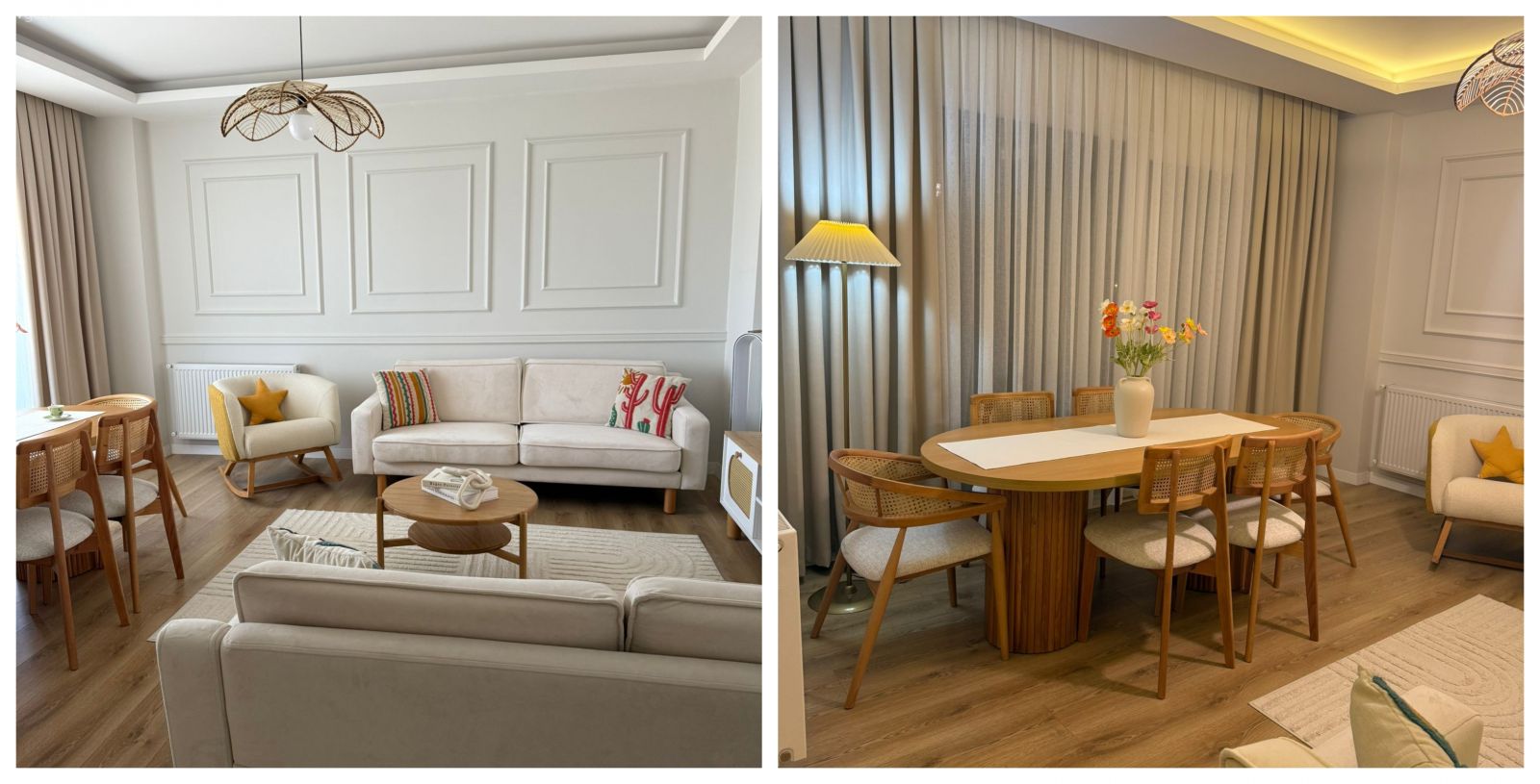 Salon, Modern, Beyaz, Krem, Bej, Koltuk takımı, Berjer, Duvar çıtalama, Orta sehpa, Sehpa, Halı, Salon halısı, Hasır sandalye, Sandalye, Yemek masası, Avize, Aydınlatma, Hasır avize, Fon perde, Perde, Tül perde, Kırlent, Ev tekstili, Parke