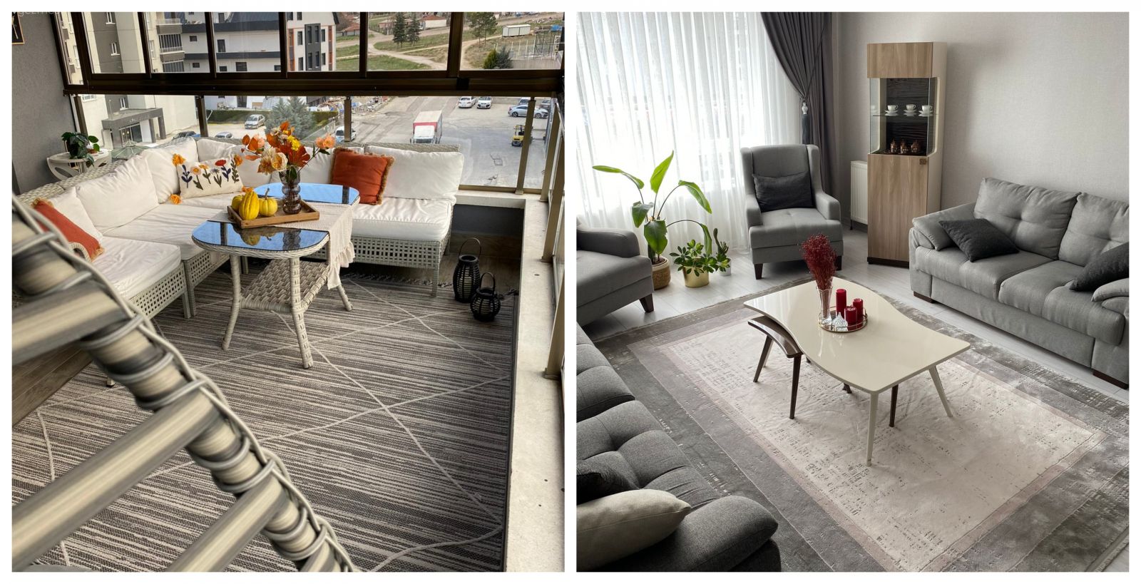 Renkli kırlentlerle daha keyifli hale getirdiği balkonu halı ve salıncak ile tamamlamış.
