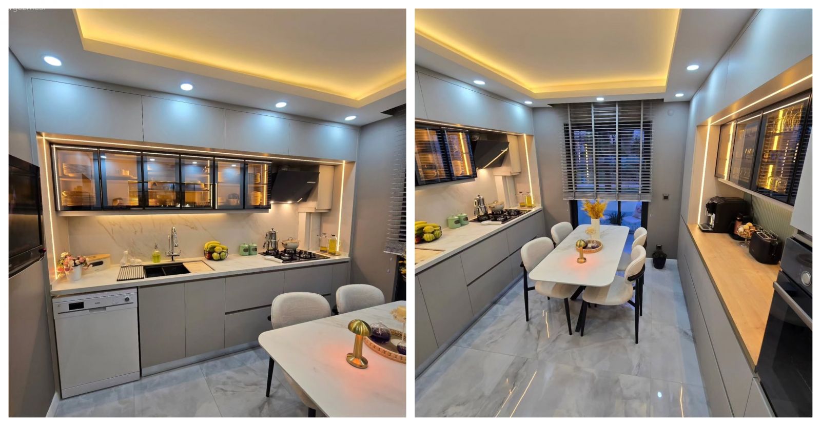 Gri renkli kulpsuz mutfak dolapları bu noktada önemli gösterge olmuş. Dolapların akıcı hali, beyaz tezgah ve tezgah arası ile pekiştirilmiş.