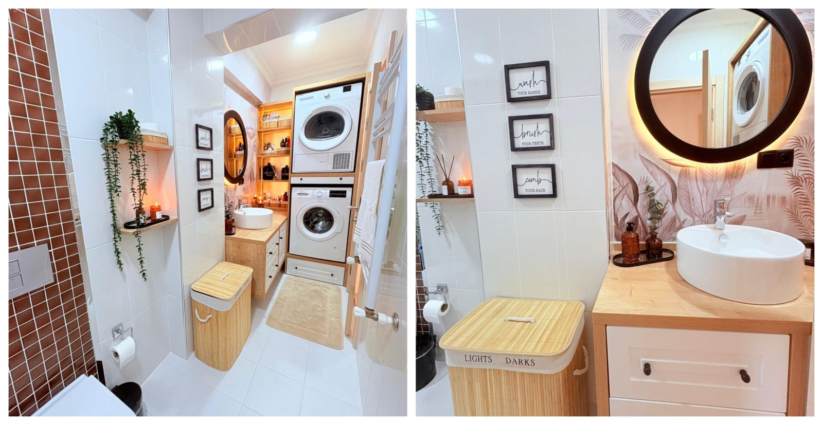 Son olarak yuvarlak ayna, duvar çerçeveleri ve birçok obje ile tamamlanan banyo eski halinden çok uzaklaşmış.