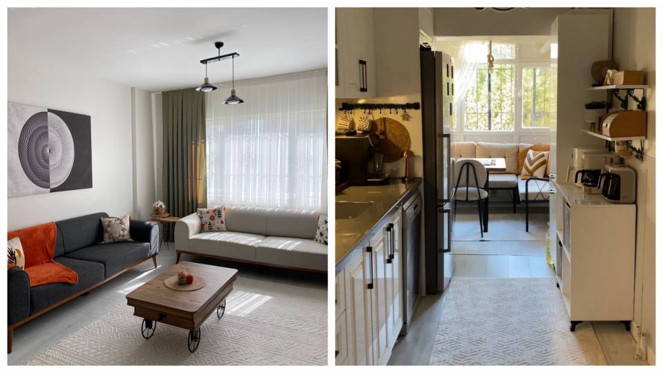 İlk modelde balkon geniş olduğu için hem açık raf tipi dolap hem de kapaklı dolaplar yer alıyor. Burada balkon büyük olduğu için arka kısmında lambri plakaların olduğu açık raf tipi dolap vtirin görevini üstlenmiş. Kapaklı dolaplar ise evin ekstra depolama alanına dönüşmüş!