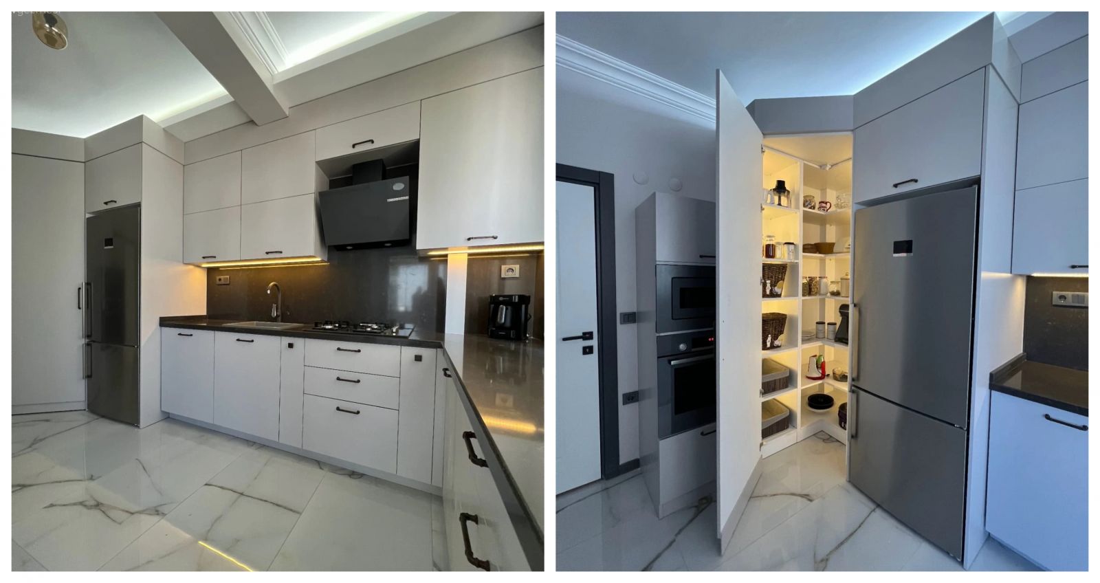 L-tipi bölüm dışında kalan buzdolabı, kiler ve ankastreler için özel tasarım yapılmış. Kademeli şekilde boyutu azalan bu dolaplar ortamı işlevsel kılmış.