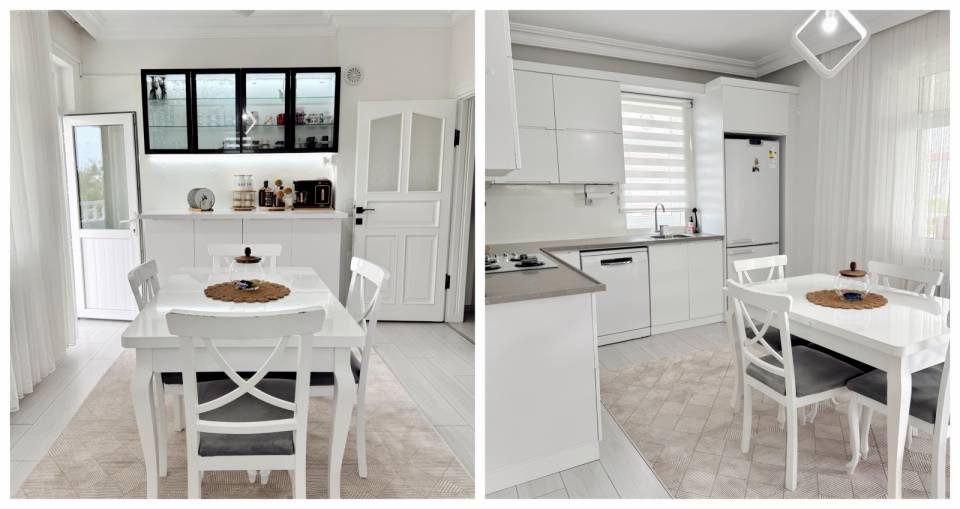 Mutfaın tarzı istendiği gibi modern olmuş. Bu tarzın çok sevdiği beyaz ve siyah ortaklığı evi kuşatmış.
