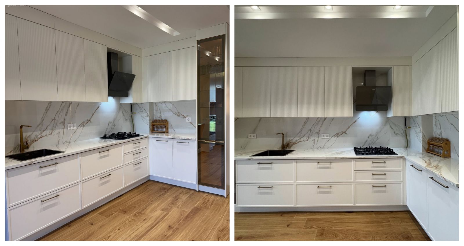 Beyaz rengin baskın olduğu dolaplarda farklı kapak tasarımları uygulanmış. Alt kapaklarda çerçeveli düz kapağa başvurulmuş. Üst kapaklarda da lambri öne çıkmış.
