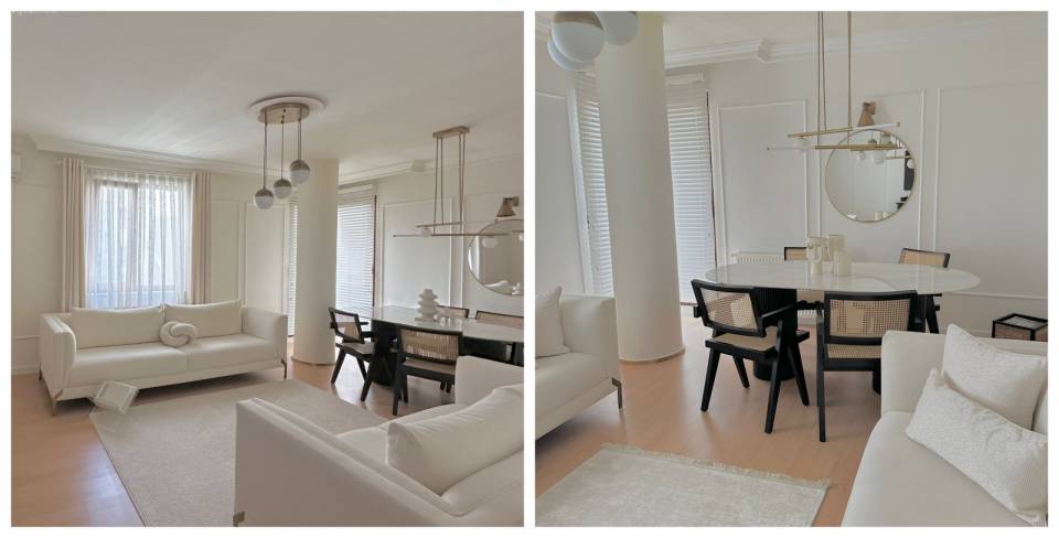 Bunun dışında üçlü ve ikili koltuk ile oturma bölümü oluşturuldu. TV için de uzun bir sehpa tercih edildi. Bunun sebebi sehpanın kalan kısımlarının üstüne bir şeyler koymak için kullanılabilmesi...