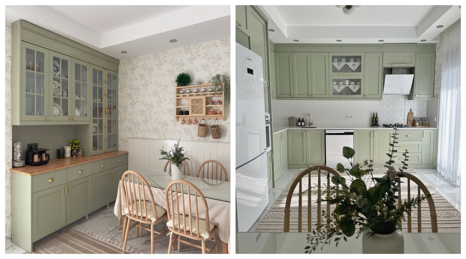 Mutfak, Country, Yeşil, Beyaz, Krem, Bej, Ahşap Mobilya, Mutfak masası, Mutfak tezgahı, Mutfak tezgah arası, Mutfak aksesuarları, Davlumbaz, Mutfak perdesi, Mutfak tülü, Mutfak halısı, Cam kapaklı dolap