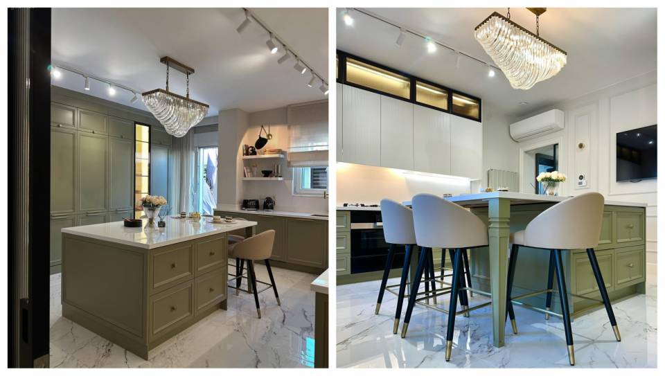 Antredeki tasarımlar metalik detaylarla desteklenmiş. Mutfakta ise camın natürel havası devreye girmiş.