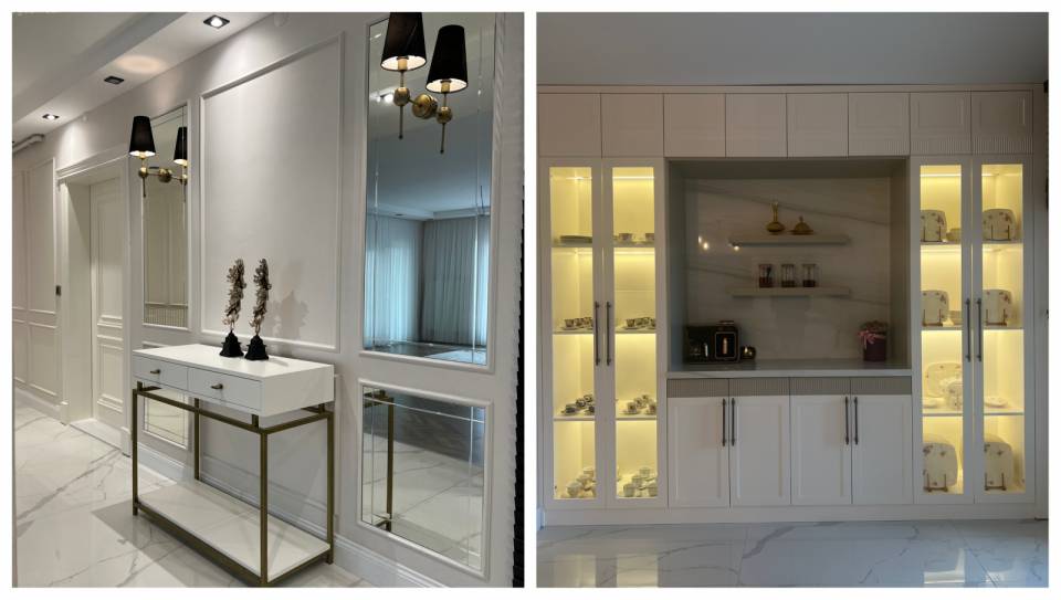 Banyo, Modern banyo, Beyaz, Krem, Banyo dolabı, Banyo aynası, Banyo aydınlatması