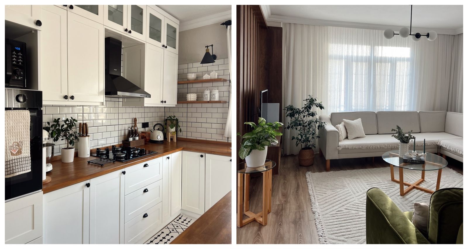 Salon, Bohem Dekorasyon, Modern, Beyaz, Yeşil, Kahverengi, Köşe koltuk, Koltuk takımı, Berjer, Orta sehpa, Sehpa, Cam orta sehpa, Duvar çıtalama, Halı, Salon halısı, Avize, Aydınlatma, Salon avizesi, Tül perde, Perde, Ev bitkisi, Kırlent, Ev tekstili