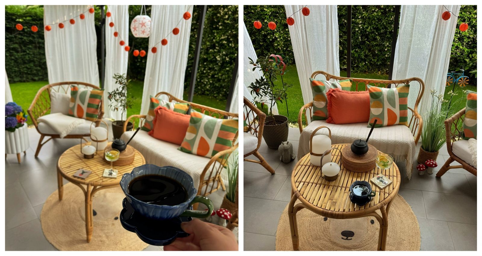 Keyifli olmanın ilk yolu konfordan geçer! Bunu bildiği için alanda rahat oturma sağlayacak hasır oturma grubu kullanmış.