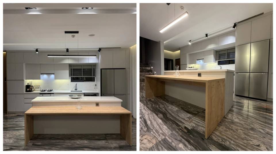 Ortamın şık görünmesi için duvarlarda antrasit panel kullanmış. Konforlu oturma takımı da şıklığa katkı sağlamış.