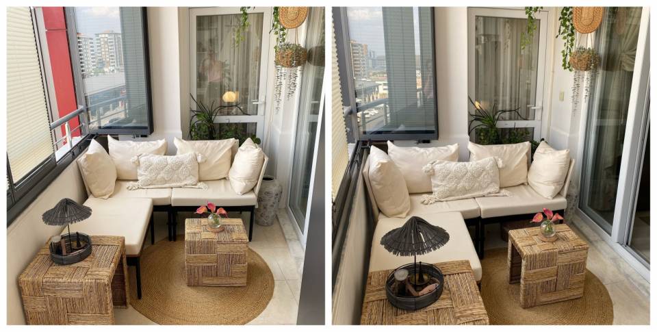 Salon, Dubleks evler, Beyaz, Bej, Krem, Kahverengi, Köşe koltuk, Koltuk takımı, Orta sehpa, Sehpa, Zemin seramikleri, Saksı, Ev bitkisi, Şamdan, Ev Aksesuar, Sandalye, Rattan sandalye, Tavan vantilatörü, Fon perde, Perde, Yazlık