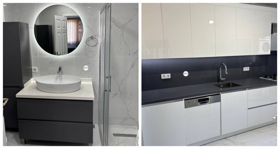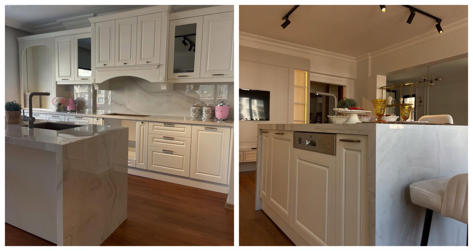 Dolaplarda shaker tasarım öne çıkmış. Cam kapaklarla desteklenen bu dolaplar, porselen tezgahla birleştirilmiş.