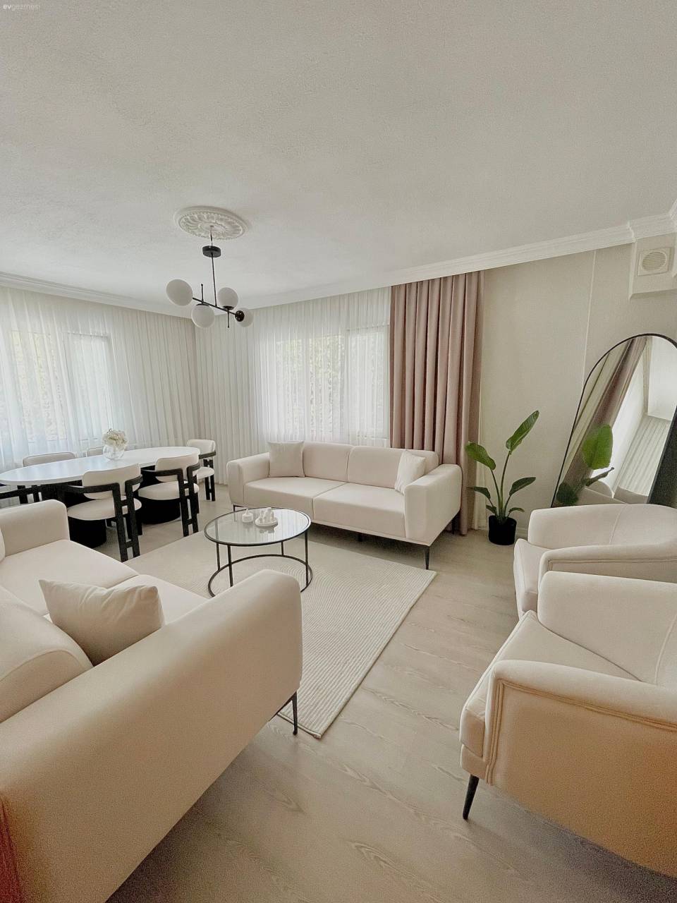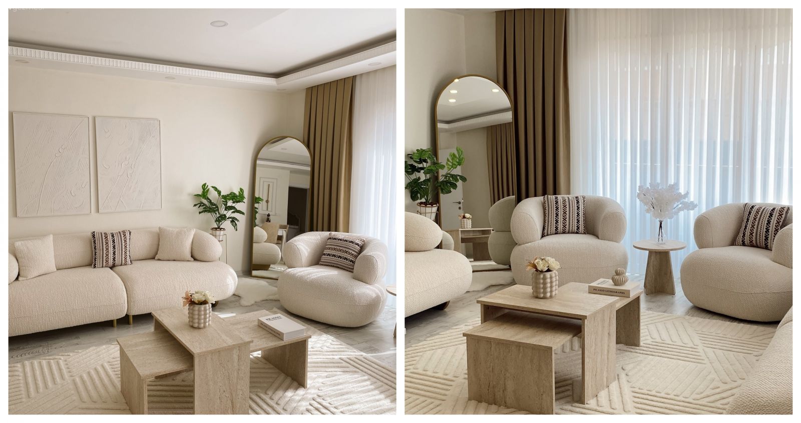 Tarz olarak modern stilin kullanıldığı evde, salon ve mutfak için seçilen her şey açık tonlardan olmuş: Beyaz, krem ve bej üçlüsü bir anlamda evin hakimi durumuna gelmiş.