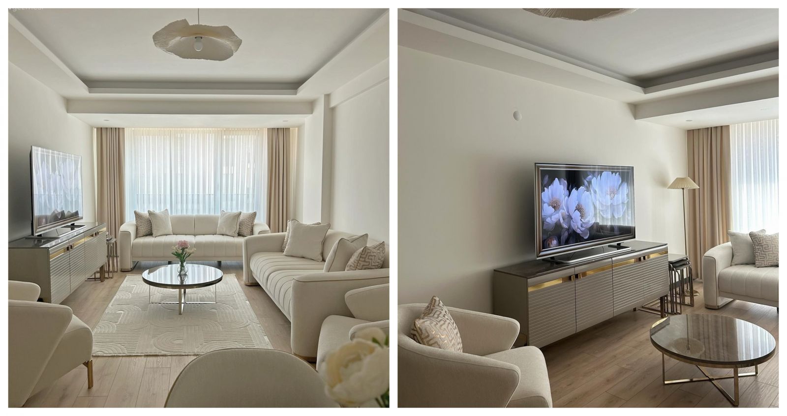 Salon, Modern, Beyaz koltuk, Koltuk takımı, Fon perde, Perde, Tül perde, Orta sehpa, Sehpa, Halı, Salon halısı, Tv ünitesi, Tv ünitesi aksesuarları, Ev Aksesuar, Kırlent, Ev tekstili, Berjer, Dekoratif Objeler, Avize, Aydınlatma, Salon avizesi