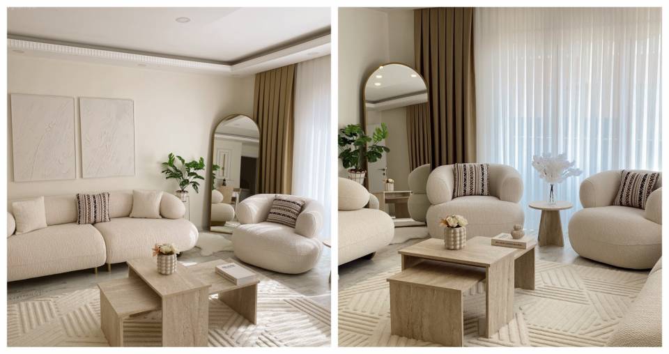 Modern tarzı hissettiren mobilyalar olmuş. Beyaz renkli koltuk takımı zamansız haliyle bunu sağlamış.
