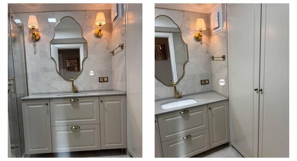 Ortamda akıcılık sağlamak için tezgah ve tezgah arasında benzer tonlar kullanılmış: Kompozit tezgah, büyük boyutlu seramik ile tamamlanmış.