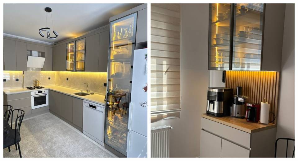 Mutfak, Modern, Amerikan Mutfak, Beyaz, Bej, Krem, Mutfak tezgahı, Mutfak tezgah arası, Mutfak halısı, Ada mutfak, Cam kapaklı dolap, Parke, Mutfak Avize Modelleri, Dekoratif Objeler, Mutfak perdesi