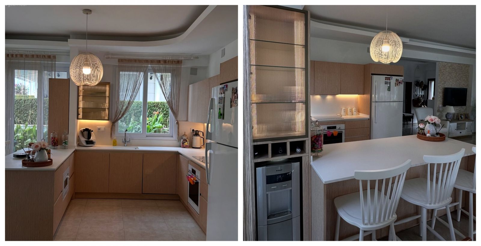 Mutfağın tarzı da modern. Ama donuk bir modern değil! Ahşap görünümlü kapaklarla sıcaklık sunan bir modern...