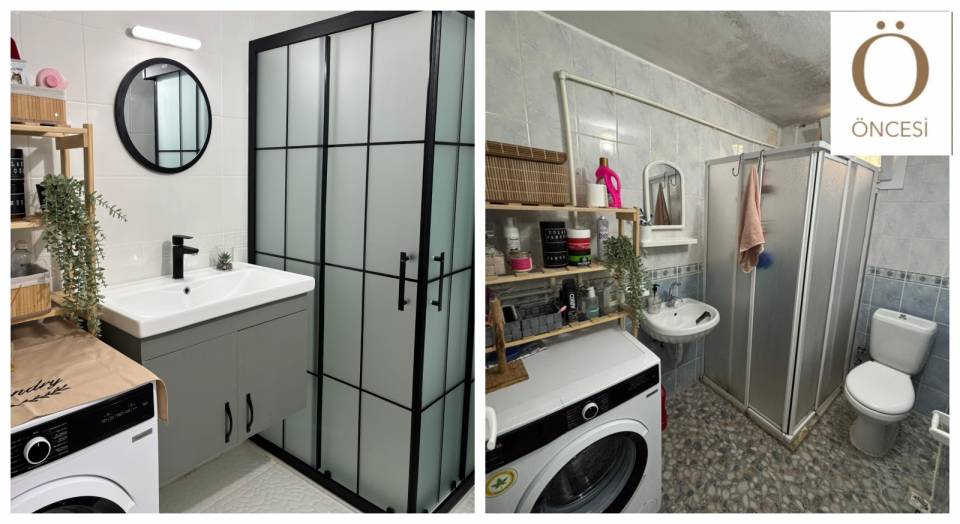 Evin bir diğer banyosu da tasarım olarak diğerini devam ettirmiş. Burada duşakabin yerine küvet kullanılmış.
