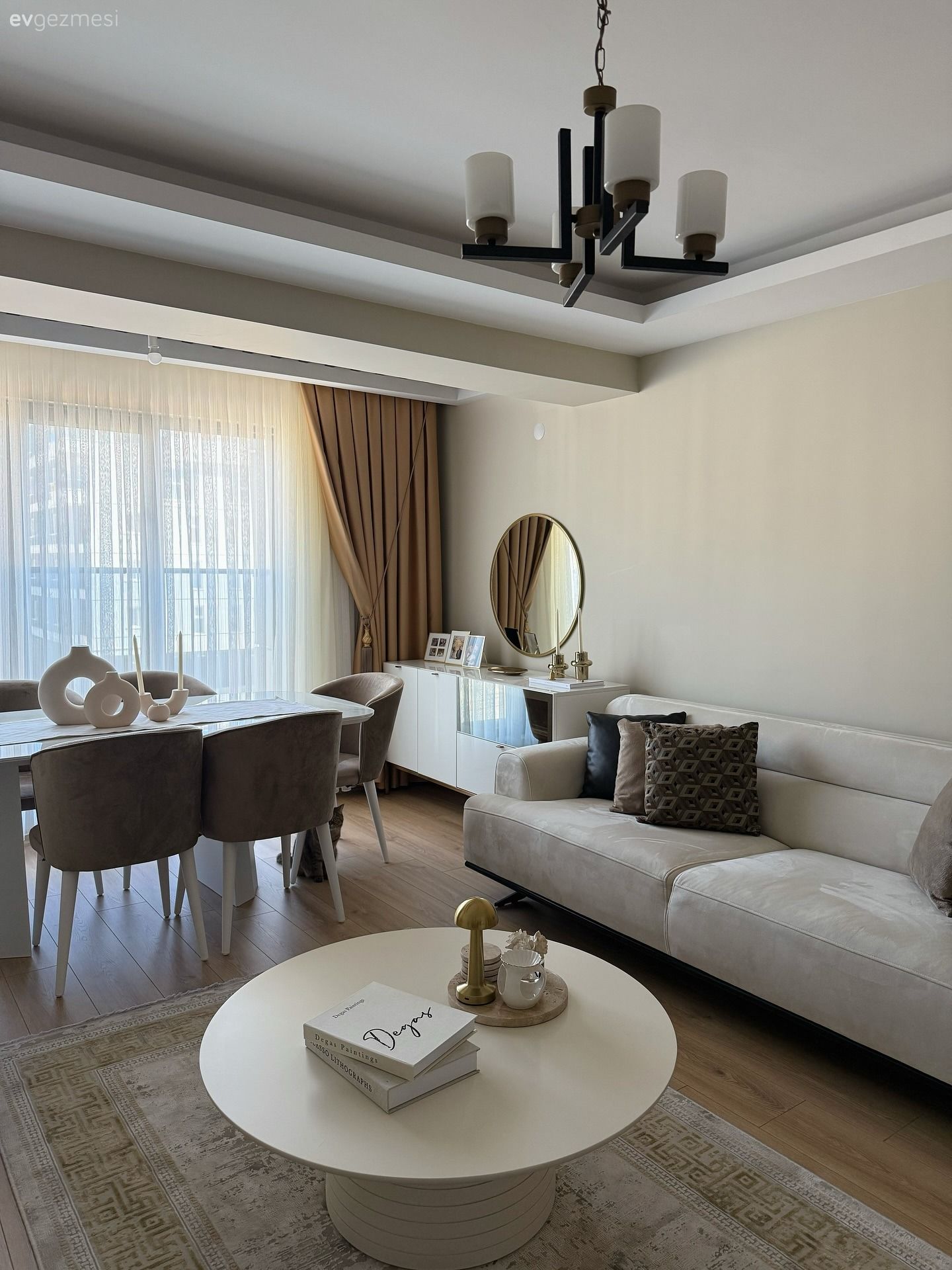 Yuvarlak ayna, zarif avize ve alana cazibe katan halı ile birlikte ev sahibimiz salonunda eksikleri tamamlamış.