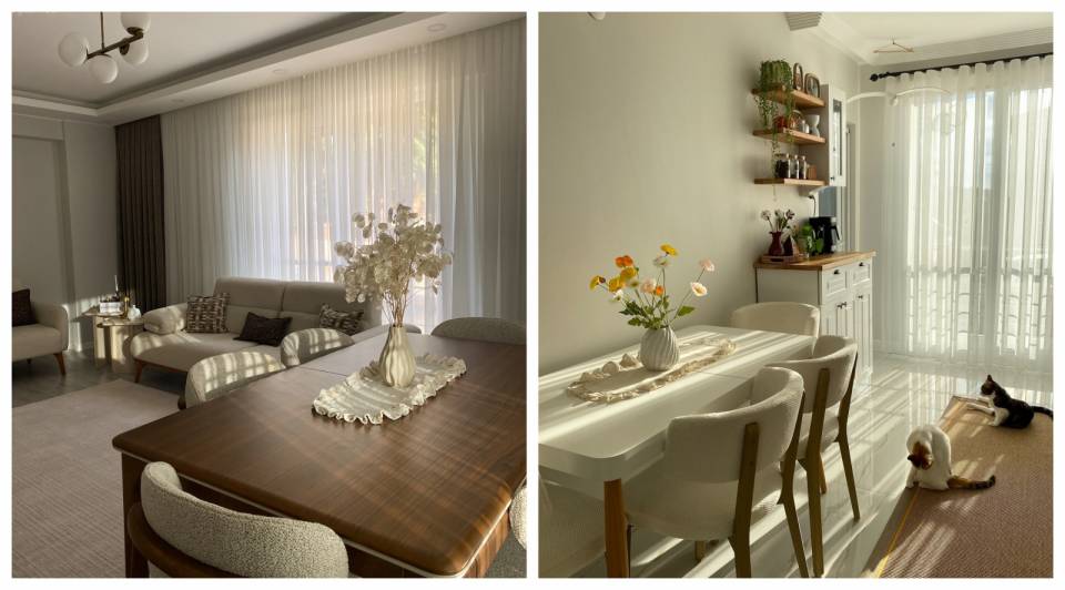 Kitaplık, Özel yapım dolaplar, Dolap, Beyaz, Bej, Köşe koltuk, Koltuk takımı, Halı, Salon halısı, Dekoratif Objeler, Puf, Duvar çıtalama