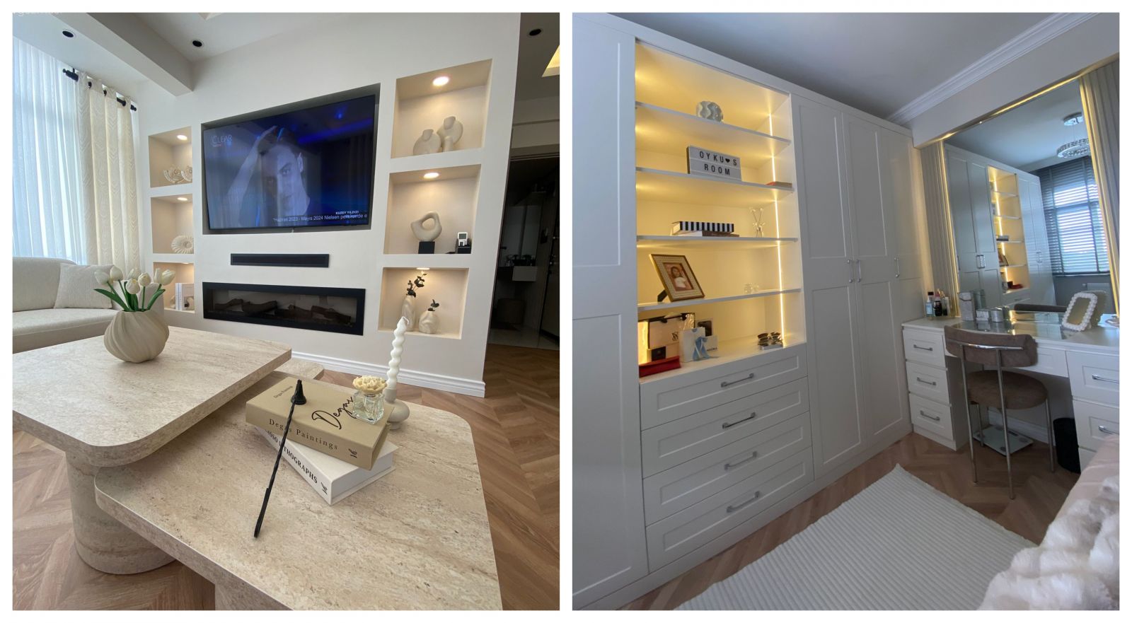 Evin bütün odaları için özel dolaplar yaptıran ev sahibimiz, çocuk odası ve giyinme odasında cam kapaklarla şıklığı arttırmış.