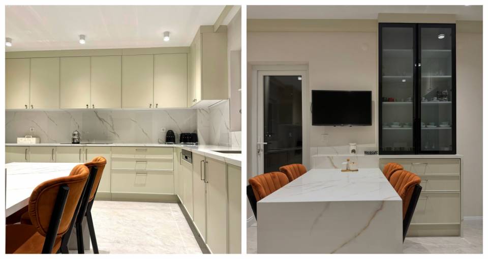 Beyaz renk ile ferahlayan bu mutfakta yine özel yapım kahve köşesi tercih edilmiş. Peteğin olduğu kısmı içine alan beyaz shaker kapaklı kahve köşesinde petek hizasında kafes kapak kullanılmış. Petek üstüne gelen porselen tezgah ile tasarımın kalitesi arttırılmış. Olmazsa olmaz cam kapaklar da alanın vitrinine dönüşmüş.