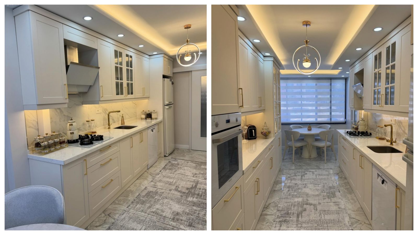 Mutfak, Modern, Koridor tipi mutfak, Beyaz, Bej, Krem, Altın, Mutfak tezgahı, Mutfak tezgah arası, Mutfak aksesuarları, Ankastre, Mutfak bataryası, Spot aydınlatma, Aydınlatma, Led aydınlatma, Mutfak perdesi, Zebra Perde, Perde, Mutfak sandalyesi, Mutfak masası, Mutfak zemin seramikleri