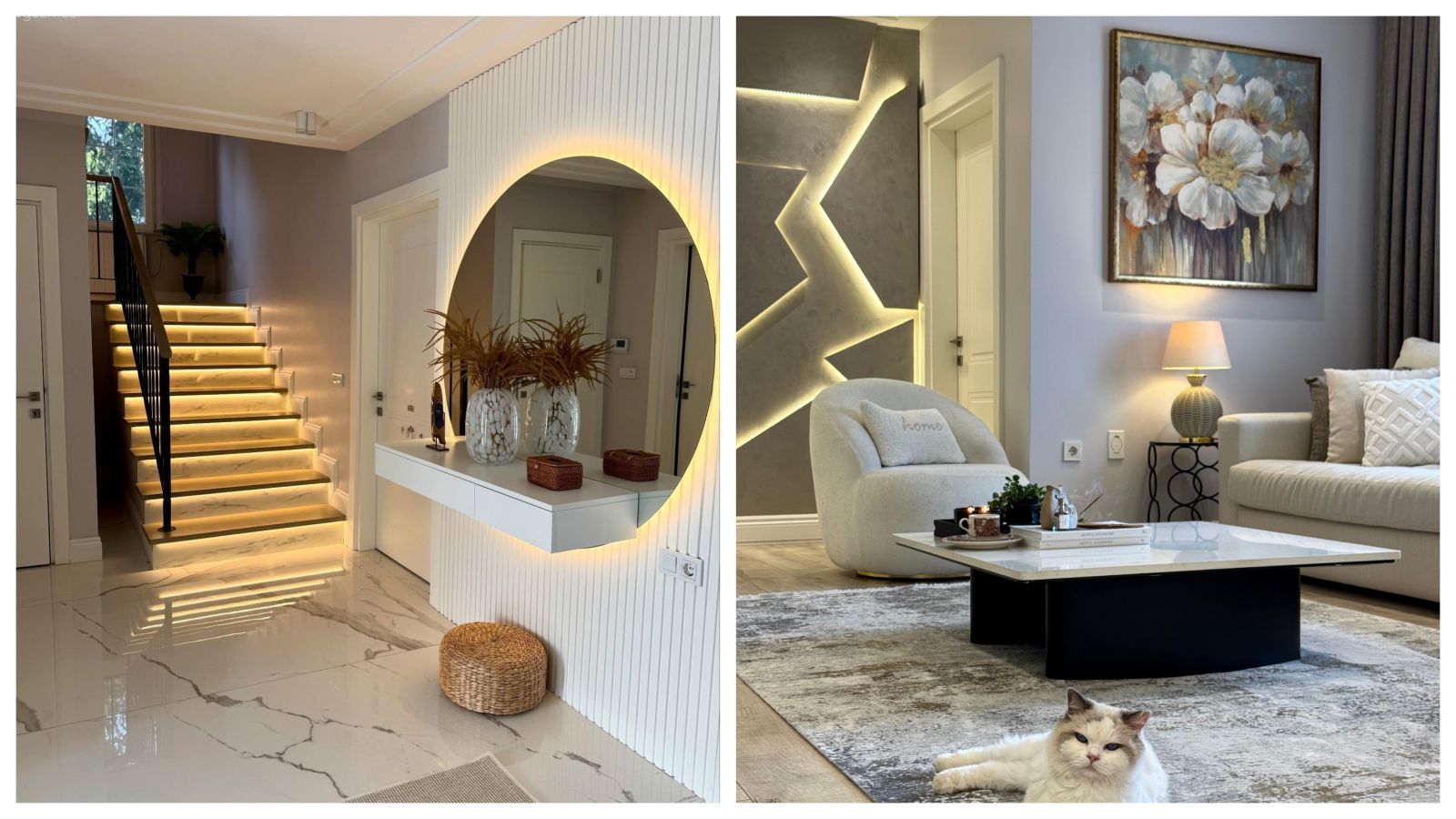 Antre, Dubleks evler, Merdiven, Yuvarlak ayna, Dekoratif ayna, Dresuar, Halı, Antre halısı, Zemin seramikleri