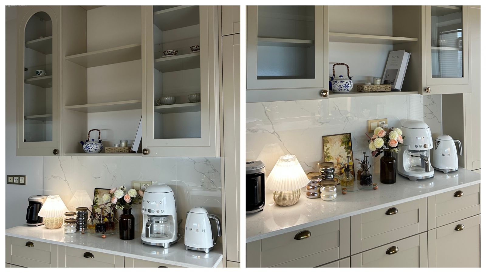 Mutfak küçük olduğu için dolap yerleşim planı koridor tipi olmuş: Bir taraf hazırlık alanı diğer taraf da kahve köşesi ve ek depolama olarak tasarlanmış!