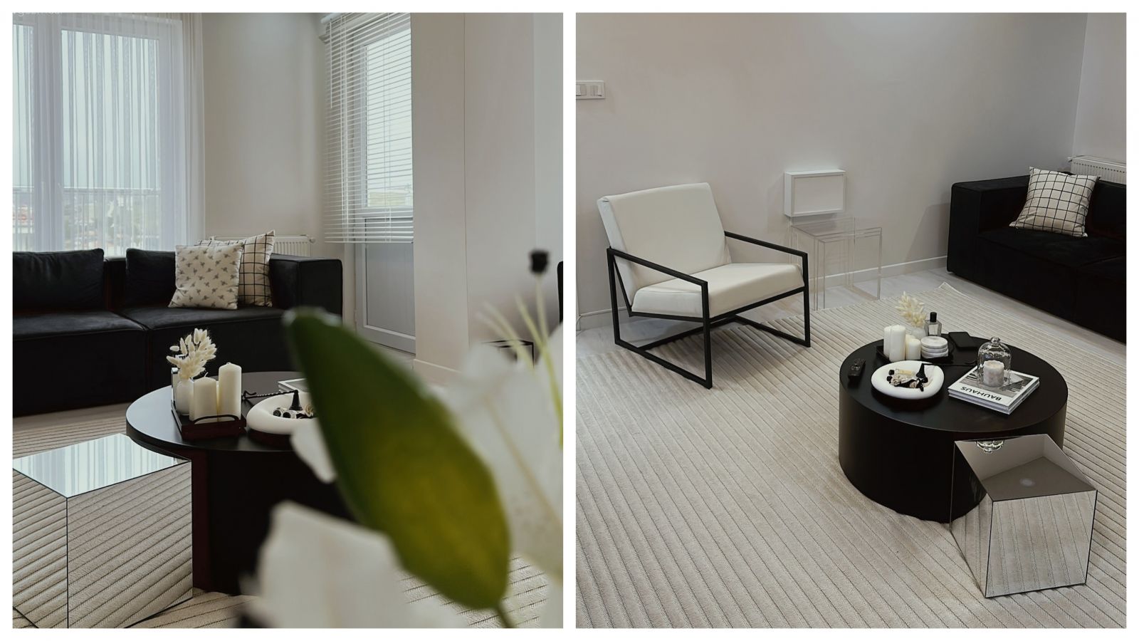 Salon, Modern, Beyaz, Siyah, Berjer, Koltuk takımı, Orta sehpa, Sehpa, Halı, Salon halısı, Dekoratif Objeler, Kırlent, Ev tekstili, Yuvarlak sehpa