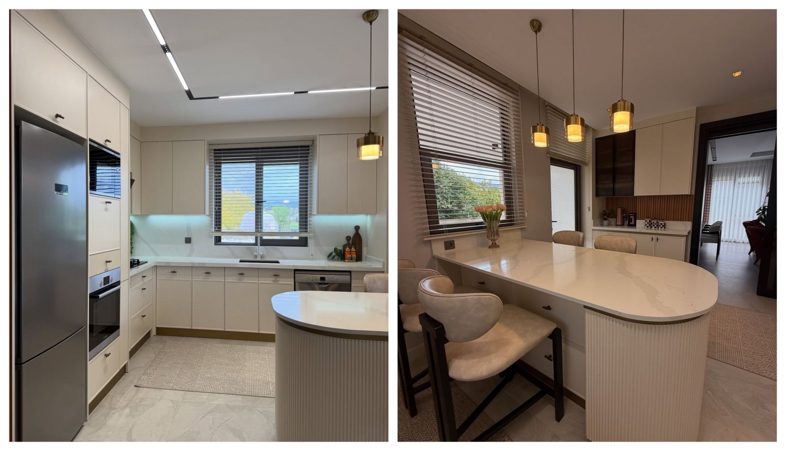 Porselen tezgah, entegre eviye, jaluzi perdeler ve gizli aydınlatmalar ile son dokunuşları yapılan mutfak, zarif görünüme kavuşmuş.
