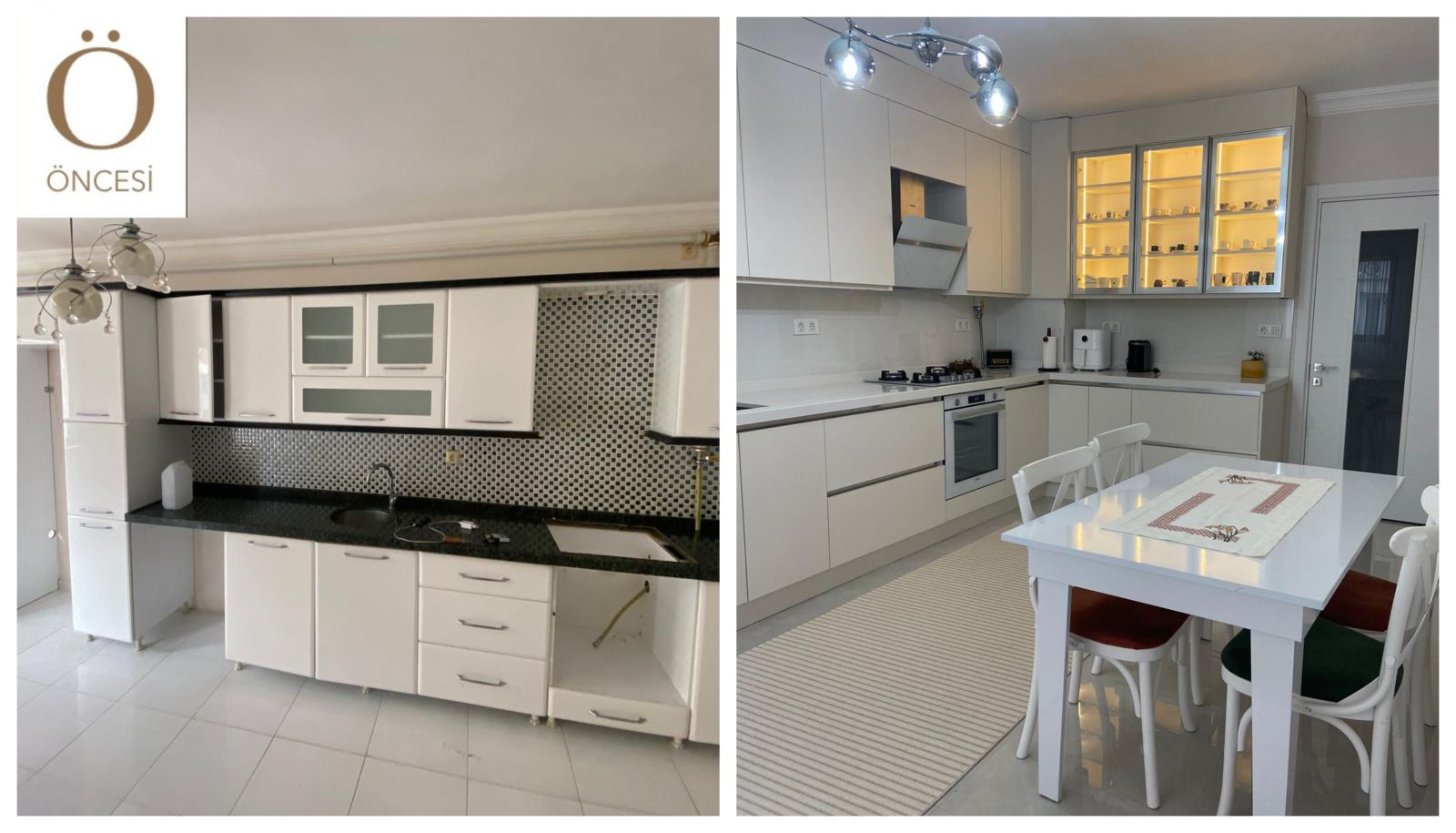 Mutfağın tadilatında yeniliğin yüzü moderne dönük olmuş. Yapılan kulpsuz dolaplar bu amaçla seçilmiş.