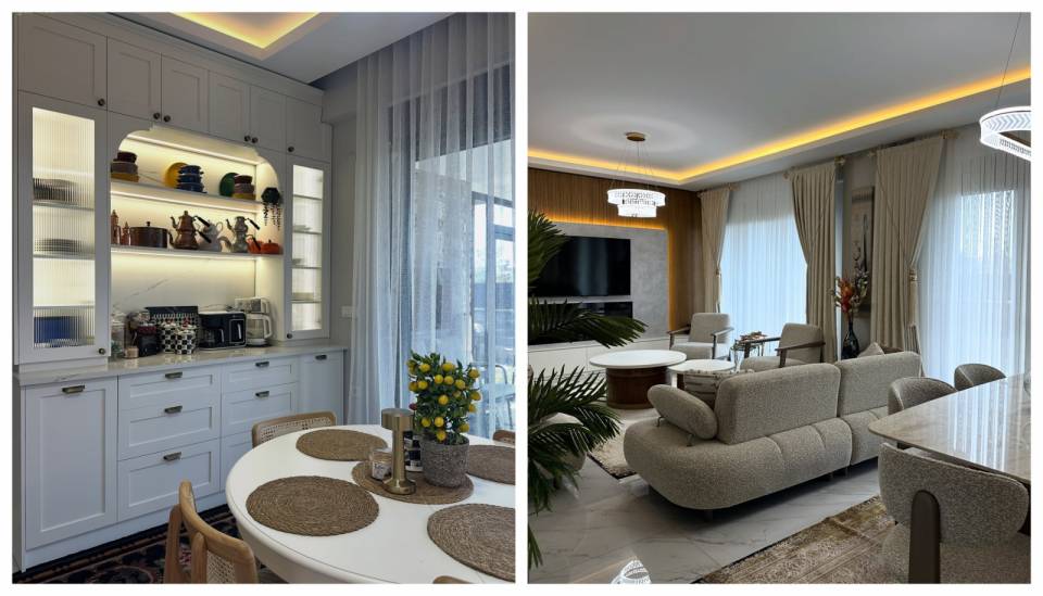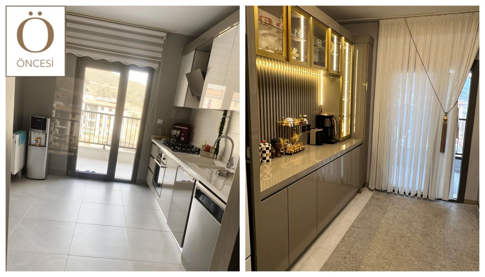 Ortamı tamamlayan beyaz tül perde ve vizon halı ile birlikte mutfak son şeklini almış.