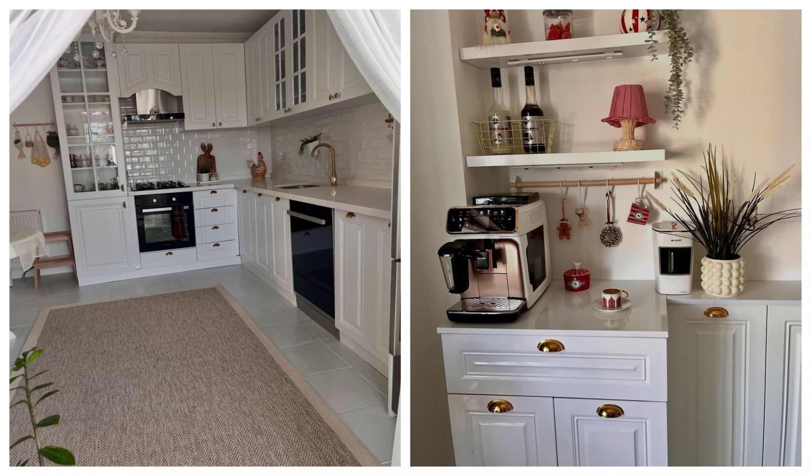 Mutfak, Beyaz, Beyaz mutfak, Shaker kapaklı dolaplar, Mutfak tezgahı, Mutfak tezgah arası, Cam kapaklı dolap, Davlumbaz, Ankastre, Jüt halı, Halı, Mutfak aksesuarları, Country, Mutfak bataryası