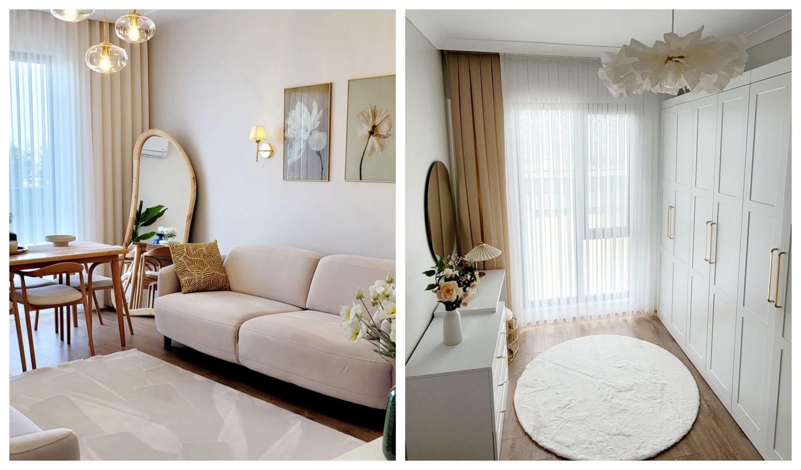 Makyaj masası, Yatak Odası, Yuvarlak ayna, Dekoratif ayna, Beyaz, Yuvarlak halı, Halı, Tül perde, Perde, Fon perde