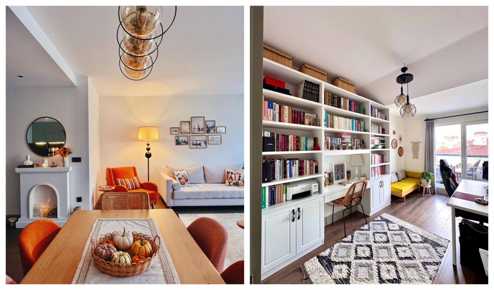 Salon, Modern, Bohem Dekorasyon, Beyaz, Turuncu, Lambader, Aydınlatma, Koltuk takımı, Yemek masası, Sandalye, Şömine, Avize, Halı, Salon halısı, Berjer, Kırlent, Ev tekstili, Yuvarlak ayna, Dekoratif ayna