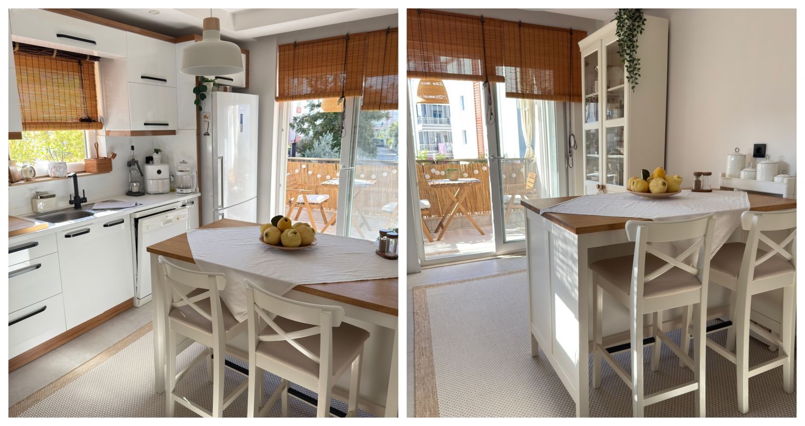 Mutfağa sıcaklık katmak isteyen ev sahibimiz çözüm olarak perdeleri seçmiş. Mutfağın her penceresinde yer alan bambu perdeler hasır sıcaklığını dekora katmış.