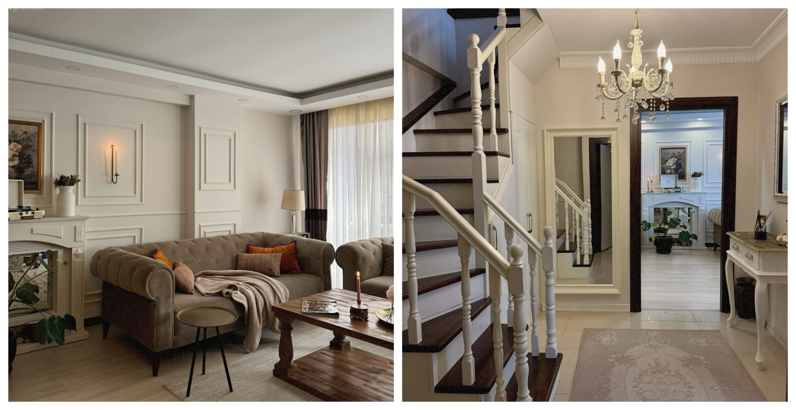 Üst kata çıkışı sağlayan merdivenlerinde sıcaklığı devam ettiren Atike Hanım, beyazı bu bölümde baskın tutmuş.