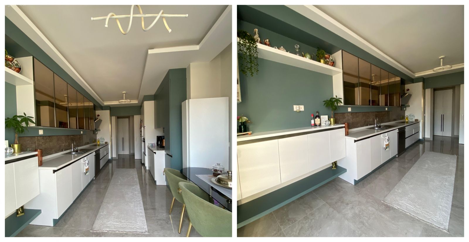 Mutfakta renk dengesine bakıldığında yeşilin sesi baskın olmuş. Duvarlarda ve dolapların bir kısmında kulllanılan bu renk dekora farklılık katmış.