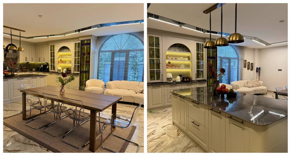 Dekorun büyük parçalarında minimalist ve modern davranmış: İki renkli geniş oturumlu kanepeler ve onları tamamlayan parçalar...