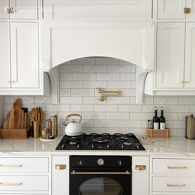 Beyaz shaker kapakların kullanıldığı bu dolaplara vitrin görevi üstlenen cam kapaklar eşlik etmiş. Duvar rafı da görüntüyü pekiştirmiş.