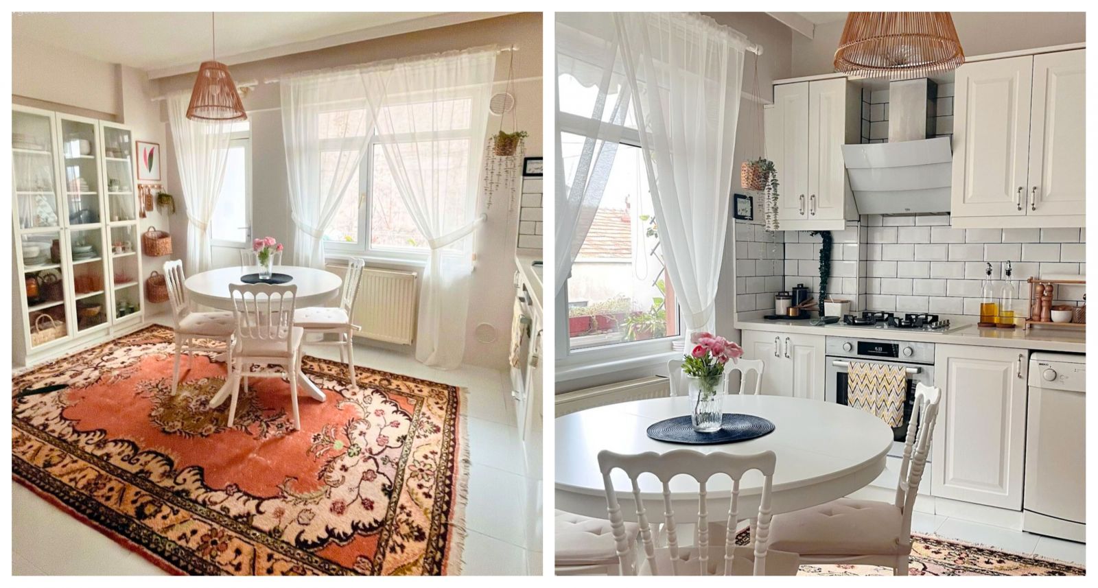 Mutfağa biraz hareket katmak isteyen Hilal Hanım, zeminde dikkatleri üstüne çeken vintage halı kullanmış.