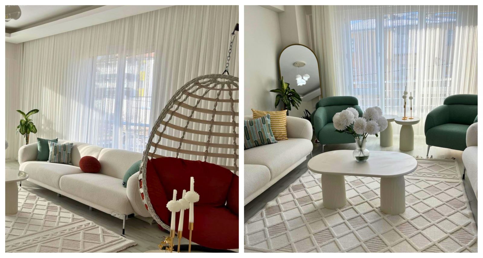 Burada ferahlığı sağlamak adına birçok büyük parçada beyaz renge yer vermiş: Kanepeler, halı ve perdeler beyaza teslim edilmiş!