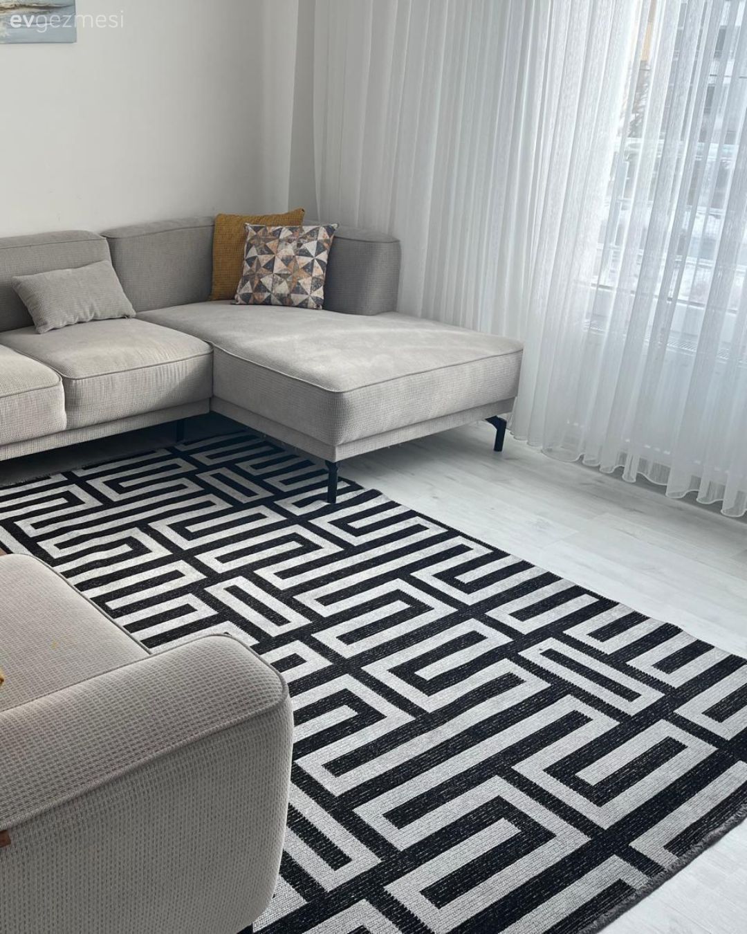 Salon dışında oturma odasını da bizimle paylaşana Ayşe Hanım, burada modernin sevdiği her detaya yer vermiş: Köşe koltuk, gri renk ve geometrik desenler...