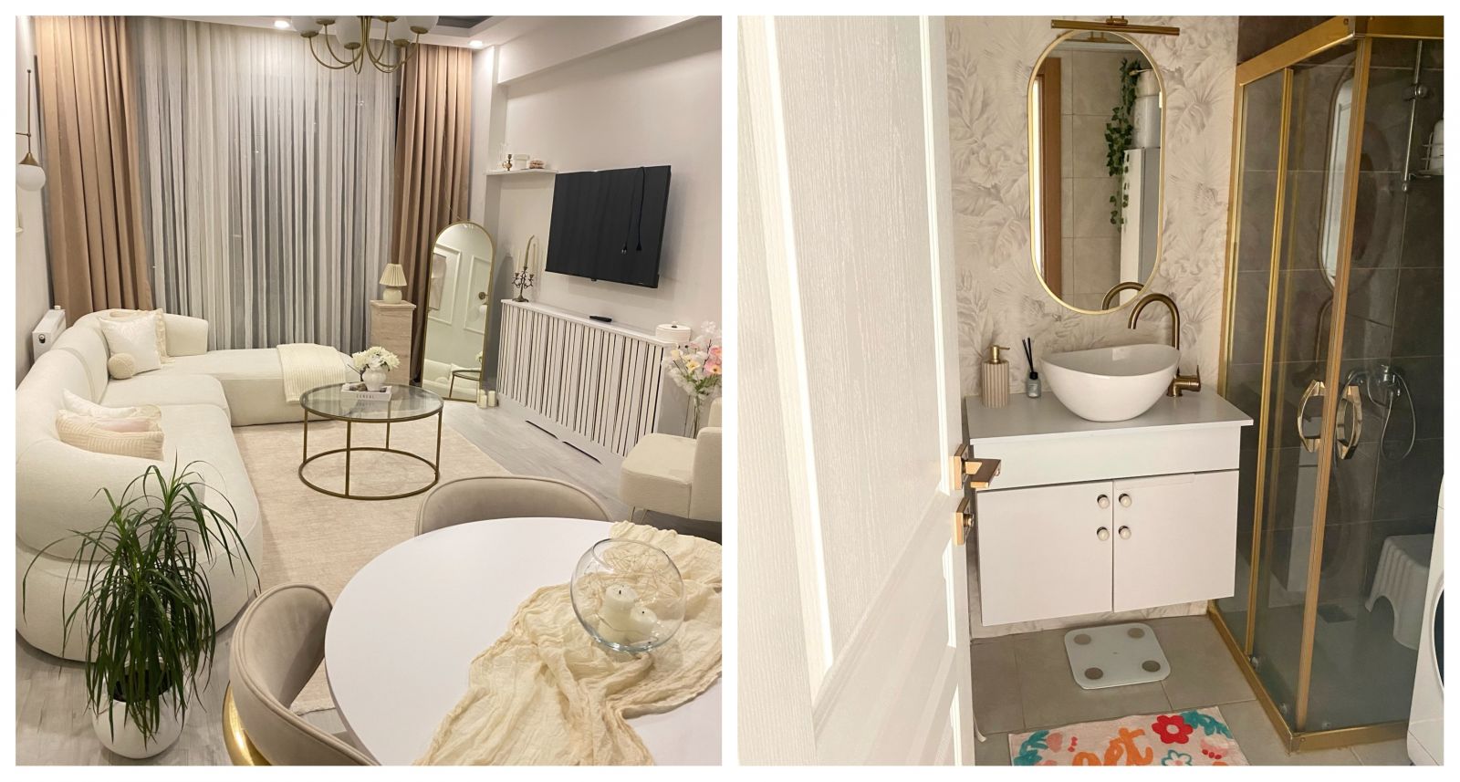 Salon, Modern, Art deko, Beyaz, Krem, Bej, Altın, Duvar çıtalama, Köşe koltuk, Koltuk takımı, Cam orta sehpa, Orta sehpa, Dekoratif Objeler, Aplik, Aydınlatma