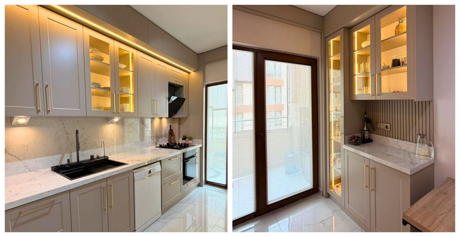 Mutfak, Vizon, Krem, Bej, Beyaz, Altın, Eviye , Mutfak bataryası, Mutfak aksesuarları, Cam kapaklı dolap, Siyah, Led aydınlatma, Aydınlatma