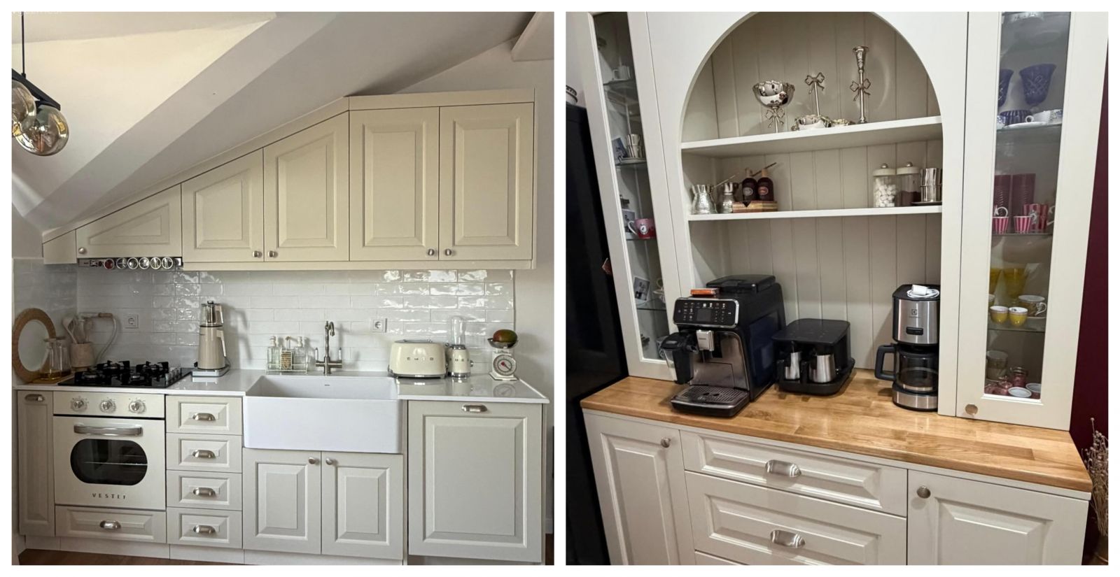 İki ayrı bölümden oluşan mutfakta bir taraf eviye ve ocaktan oluşan hazırlık alanı olmuş. Başka bir duvar ise kahve köşesi için ayrılmış.