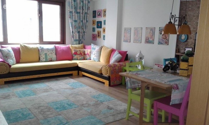 Seda hanım düşük maliyetle evinde düzenlemeler yapmayı seviyor; oğlunun odasındaki minderler eşinin eski gömlek ve kravatlarından. Üst kat mutfağın fayansları ise folyo kaplama; tezgah arası dar olunca eski bir sehpa da kaplanarak tezgahta raf olarak kullanımda..